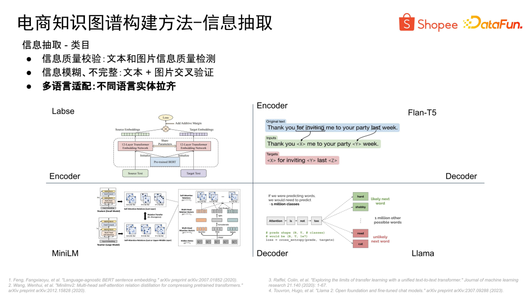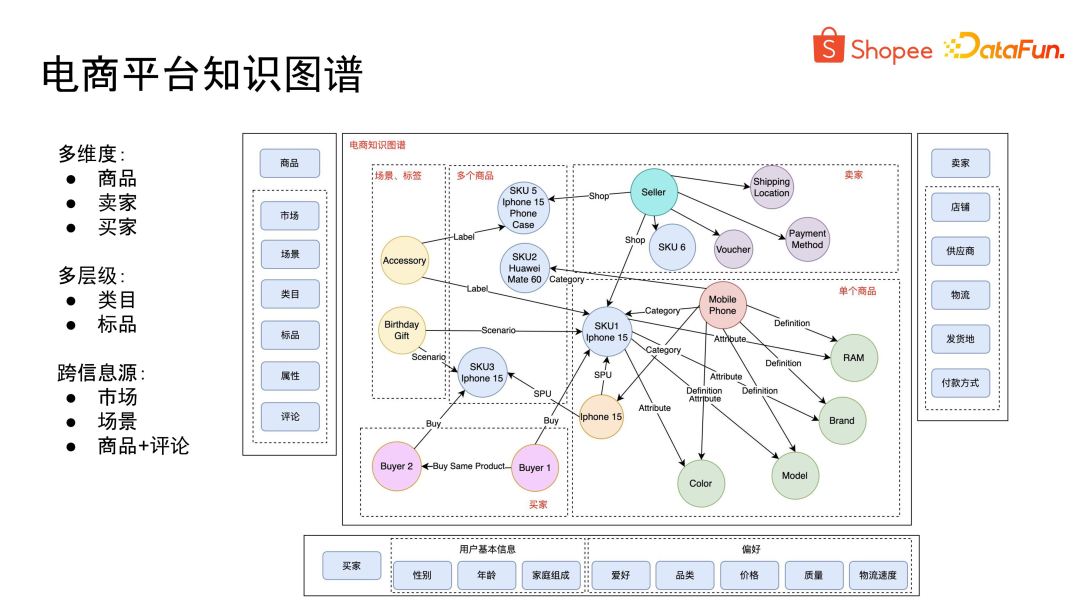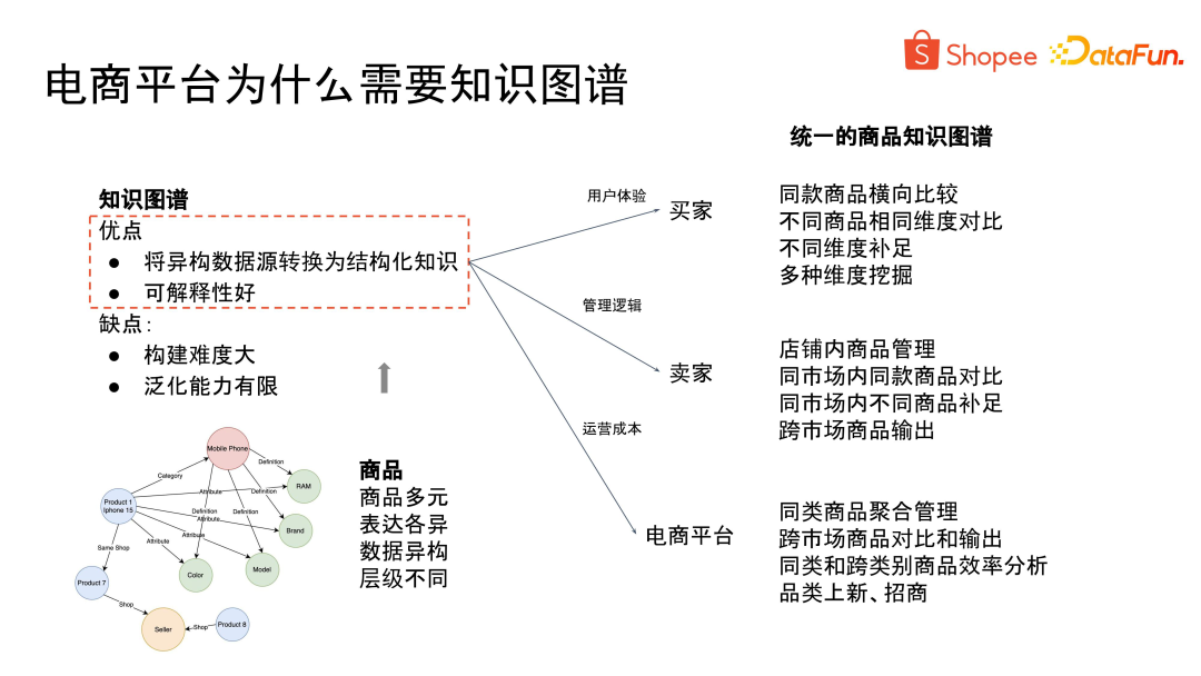 - 最后是数据量大。以 Shopee 为例,我们拥有数十亿种商品,涵盖了 8 个市场,使用了 6 种语言。如何将如此庞大的信息融合构建成一个统一的知识图谱,是一个巨大的挑战。