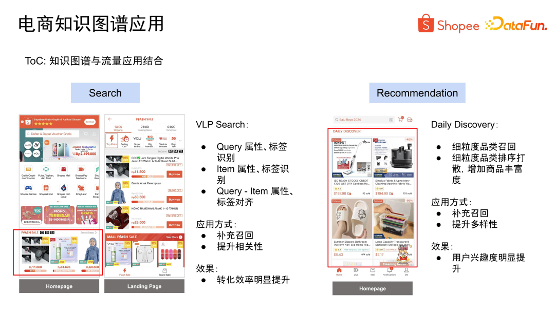 首先,知识图谱可以有效地与流量侧进行结合。在搜索场景中,以 VLP 场景为例,可以帮助处理查询,包括识别商品的特定属性和标签,然后将这些属性和标签直接注入到相应的索引系统中。当出现相关查询并解析出对应的属性和标签时,就可以进行高效的属性和标签对齐。通过这种方式,帮助搜索系统补充召回了大量相关数据,同时也提升了排序过程中的相关性。最终,转化效率也得到了显著提升。