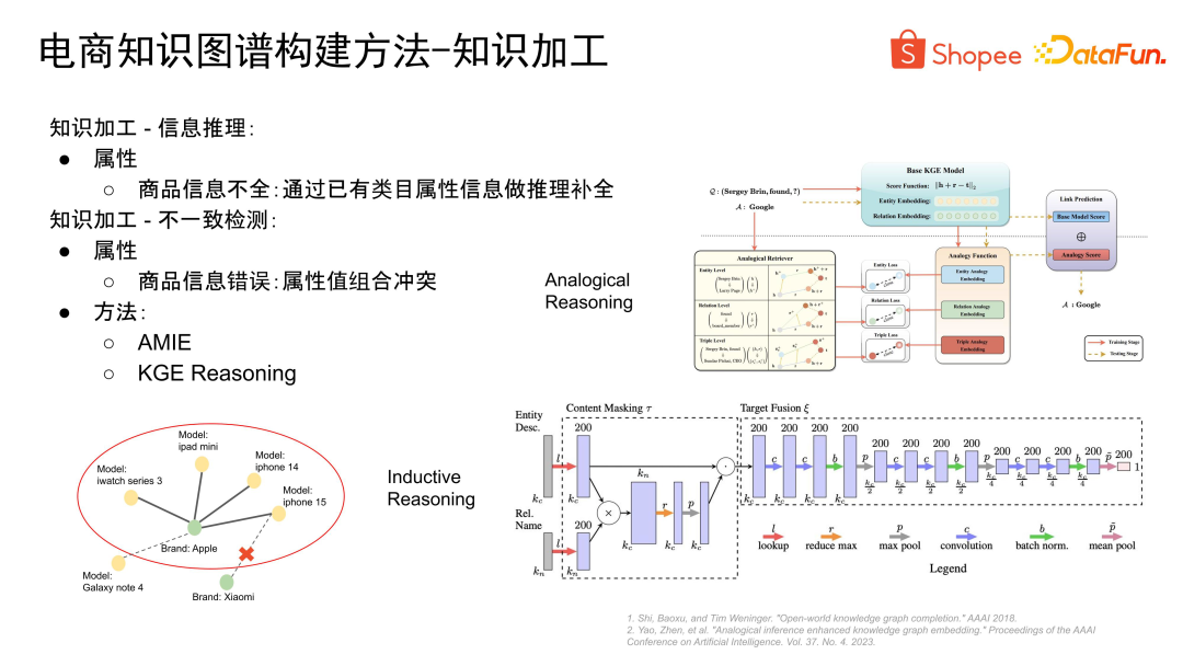 归纳推理和类比推理,都可以用于知识图谱补全。其中,归纳推理相当于从一个点出发,推理出不同方向的关系或连接的实体,可能存在于图中,也可能不存在。而类比推理则是进行平行关系的推演。它们适用于不同场景下的知识图谱补全。在电商领域中,我们经常面临信息不完整的情况,因此进行知识推理和补全尤为重要。