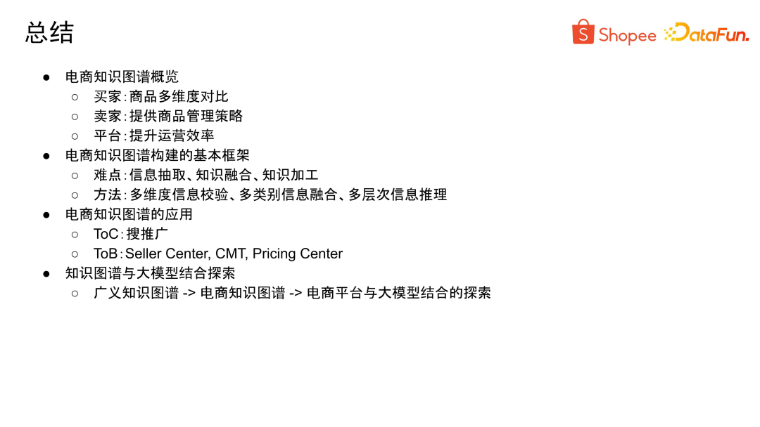 最后对本次分享进行一下总结。首先,我们通过电商知识图谱概览,分析了为什么电商平台需要知识图谱,它可以为卖家、买家和平台带来哪些帮助。接着,依照电商知识图谱构建的基本流程,针对其中的难点分享了我们的解决方案。第三部分介绍了实际的应用场景和效果。最后探讨了知识图谱以及电商平台与大模型的结合。在未来,知识图谱加大模型将会有更广泛的应用场景。