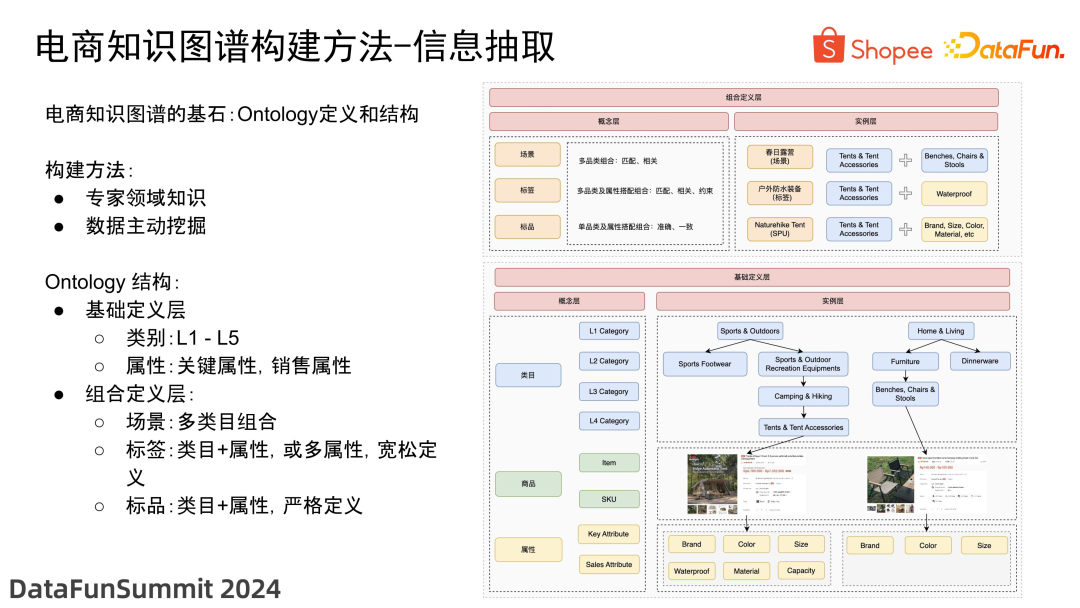 以 Shopee 为例,我们的 Ontology 结构主要分为两层:- 第一层是基础定义层,包括一些基础的元素,如类别和属性。类别又分为多个层级,从 L1 到 L5,属性也包括关键属性和销售属性,这些都与实际业务场景密切相关。