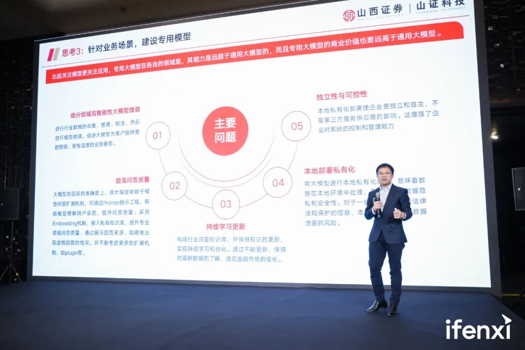 大模型可以划分为两大类别。首先是通用大模型,像这样的模型通常由大型科技公司开发。通用大模型旨在一个模型中解决多种问题,然而在回答许多专业性问题及与我们的业务相结合时,可能会存在一定的误导性。因此,为了更好地应用于真实业务场景,我们希望整个生态系统或合作伙伴能够更多地关注和研究垂直大模型,这才是能够与业务需求相匹配而且更为紧密贴合的方向。相比之下,垂直大模型专注于捕捉特定领域中更为复杂的特征和关系,包含大量专业性的语料,以及专业的微调和优化。我们希望将这个大模型运用到垂直领域进行深度整合,使其应用更加贴近我们的行业,使其更加契合我们的应用,进而实现大模型从创意工具向真正生产工具的转变。回到金融领域,这个领域下的垂直大模型,运行速度最快的是BloombergGPT,因为它有着海量的金融市场数据,因此无论是从综合评价还是用户试用反馈来看,BloombergGPT在金融领域的表现最为出色,但很可惜的是它并不开源。除此之外,FinGPT、FinBERT、聚宝盆等开源垂直领域的模型都各具特色,但相较于BloombergGPT还有显著的差距。02 山西证券AI与大模型应用实践
