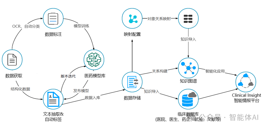 从图中可以看到,基于大模型的临床试验情报平台由多个模块组成,涵盖了从数据获取到智能情报应用的全流程。其核心模块包括:数据获取与处理、医学模型库、数据存储、知识图谱、智能情报平台等。下面我们详细解析每个模块的功能与作用。1. 数据获取与标注