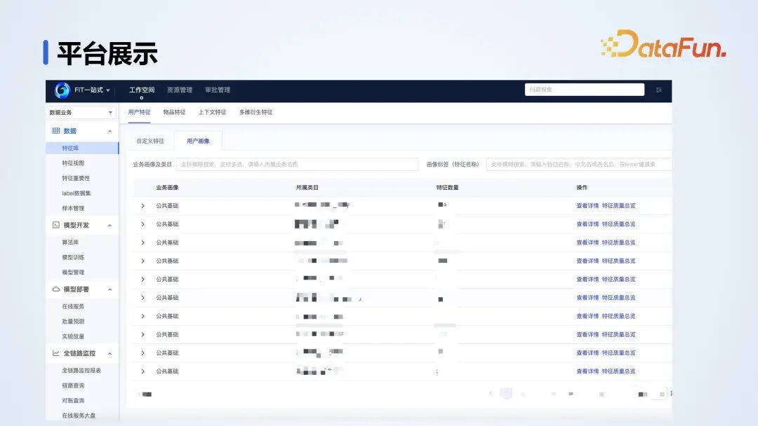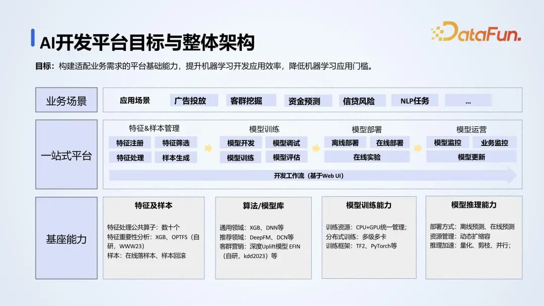 最后是整个平台结构的展示,分为数据处理、特征样本生成、模型开发与训练、模型部署以及全链路运营监控四大模块,结构清晰明了。