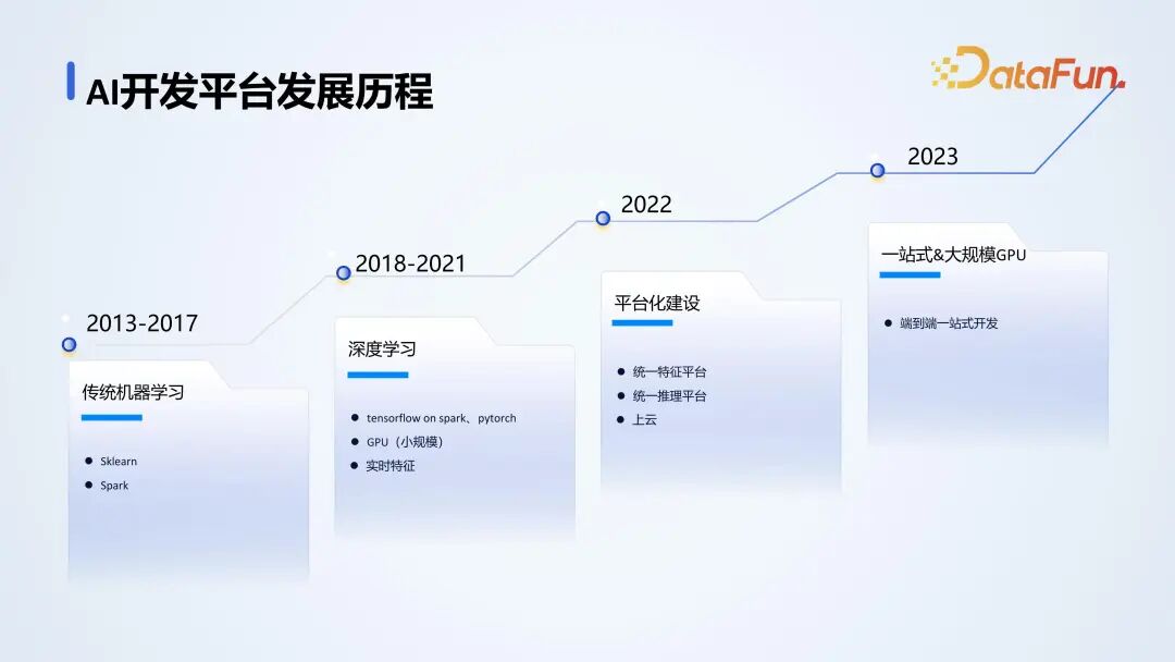 腾讯金融 AI 开发平台的发展经历了四个阶段,第一个阶段是传统的机器学习阶段,第二个阶段是深度学习的阶段。在发展过程中存在一些问题,如重复开发、特征不能共享、能力没有沉淀等,所以在 2022 年进行了统一特征平台的建设和统一推理平台的建设。到 2023 年,仍存在开发效率低和使用门槛高的问题,为解决这些问题,进行了一站式开发平台的建设。
