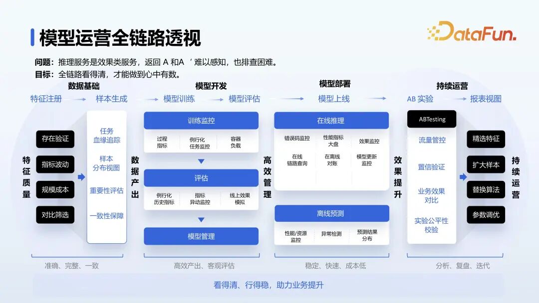 模型的全链路运营,包括特征样本监控、模型训练与开发过程监控以及在线推理的监控。在模型训练中,关注 AUC 等指标,完成后对 AUC 和测试数据进行线上预测结果的评估。在线推理阶段进行错误码、性能、效果等方面的监控,包括问题定位工具、在线模型分数、离线预测监控以及与 AB 实验系统的对接。