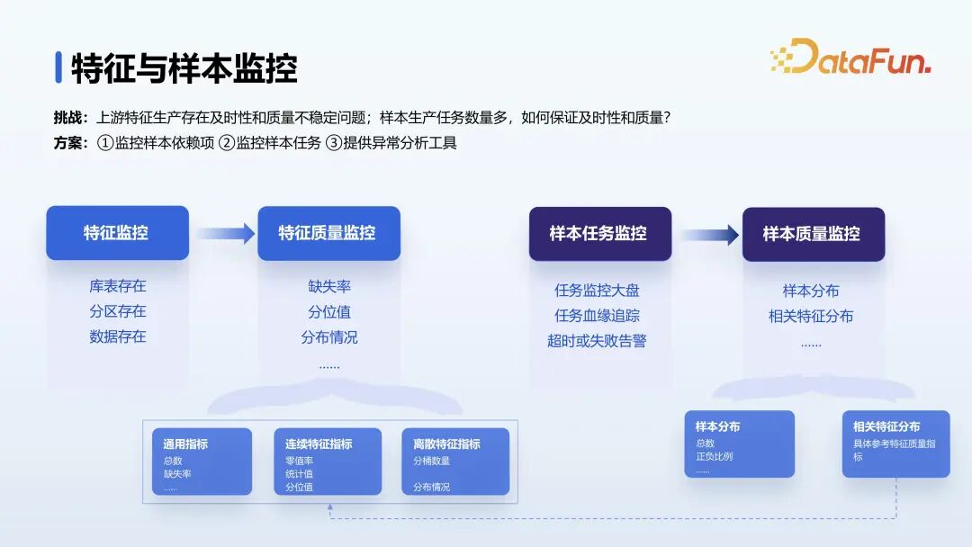 特征上线后,上游特征可能会存在及时性和质量不稳定的问题,我们对特征和样本进行监控,比如特征缺失率、分布;样本条数的变化、分布的变化等。以快速发现和解决问题。