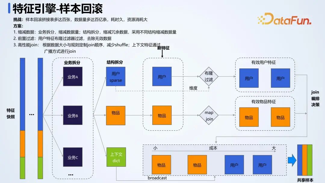 在样本拼接过程中,由于样本回滚需要拼接的主题表数量众多,且数据量较大,对性能带来了挑战。为解决这个问题,在生成特征快照时,按业务拆分特征,缩减数据量,同时采用 Sparse 存储格式进行数据存储。另外,在处理用户与 Label 拼接时,使用布隆过滤器解决 join 性能问题。对于公共特征,可将其转化为字典类型,然后使用广播进行 join。同时,针对多表 join 的情况,可在内存中 join 小表,然后将大表的数据放在硬盘中 join,以提升 join 效率。