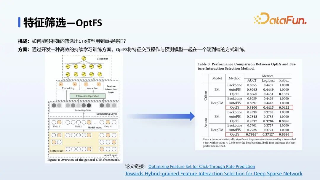 在特征筛选方面,我们开发了一种高效的持续学习的训练方案,能够准确地筛选出 CTR(用户点击率预估)模型的重要特征,该模型将特征交互操作与预测模型一起在一个端到端的方式训练,该方法已经发表论文,论文链接见图片。
