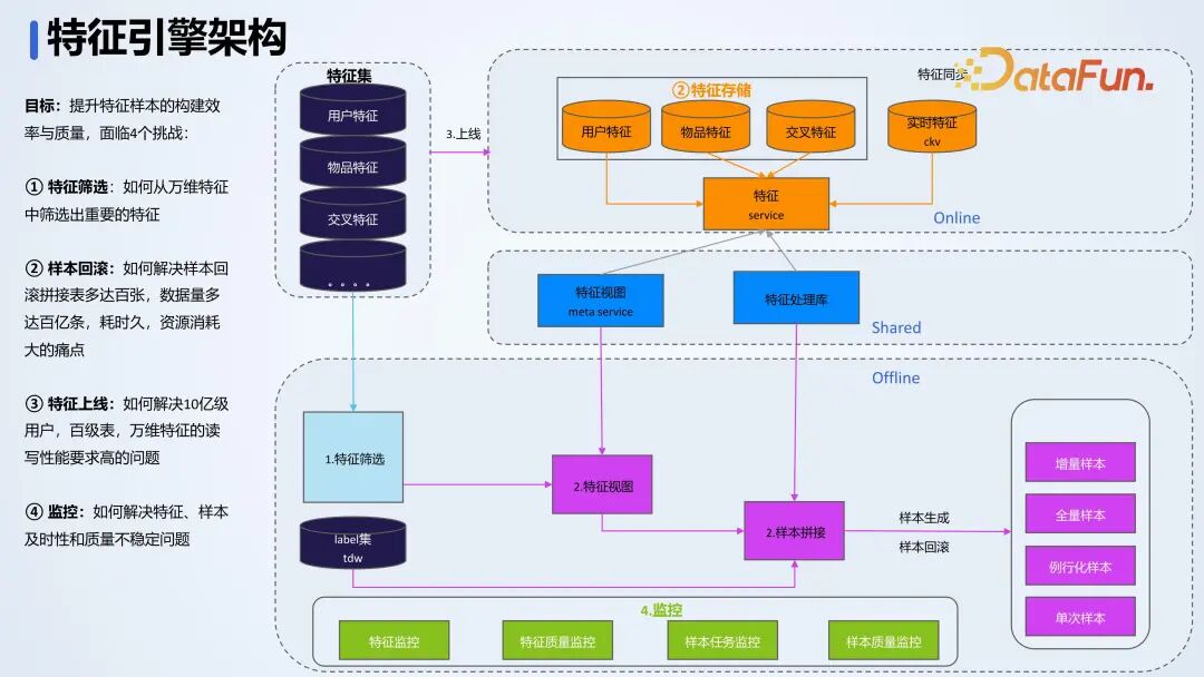 上图是特征引擎的架构,主要分为两部分,在线服务和离线服务。在线特征服务主要提供特征推理、特征读取及特征处理服务。离线特征服务主要提供特征筛选和特征拼接。特征上线后,需要对特征和样本进行监控。整个过程中,会遇到四个问题:特征筛选、样本回滚、特征上线和监控。