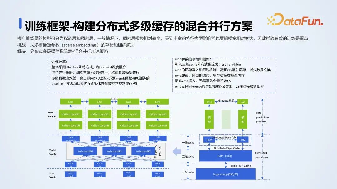 • 缓存优化:采用三级缓存的方式进行优化,利用 SSD 类存储、内存、显存构建三级缓存来解决 Embedding 的读取性能问题。