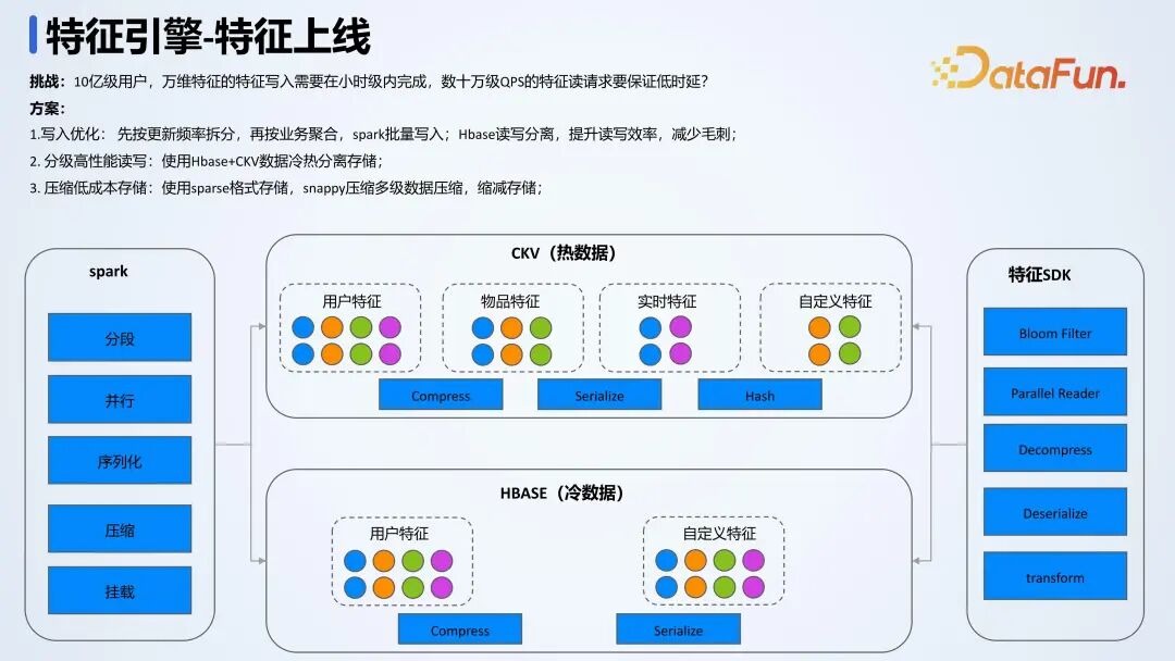 特征上线后,首先根据特征的更新频率进行拆分,然后按照业务进行聚合,以解决读写性能问题。其次,通过数据分离降低成本,将冷数据存在 HBase 中,热数据存储在 CKV 中;为了解决读写的相互影响,对 HBase 进行了读、写分离。