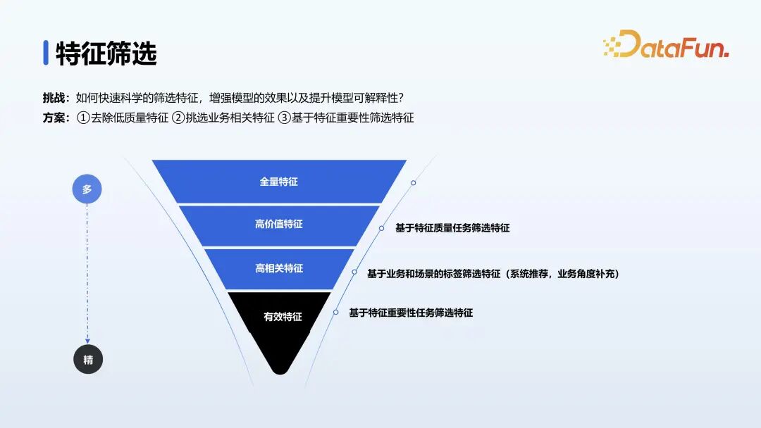 特征筛选是建模的第一个步骤,特征决定了机器学习效果的上限,模型只是逼进这个上限,所以特征筛选是一个非常重要的步骤。首先基于特征质量从全量特征中筛选出一些高价值特征,然后基于业务场景,推荐历史表现较好的特征。特征初筛后,基于特征重要性的算法来进行特征重要性的筛选,比如过滤法、包裹法、嵌入法等。