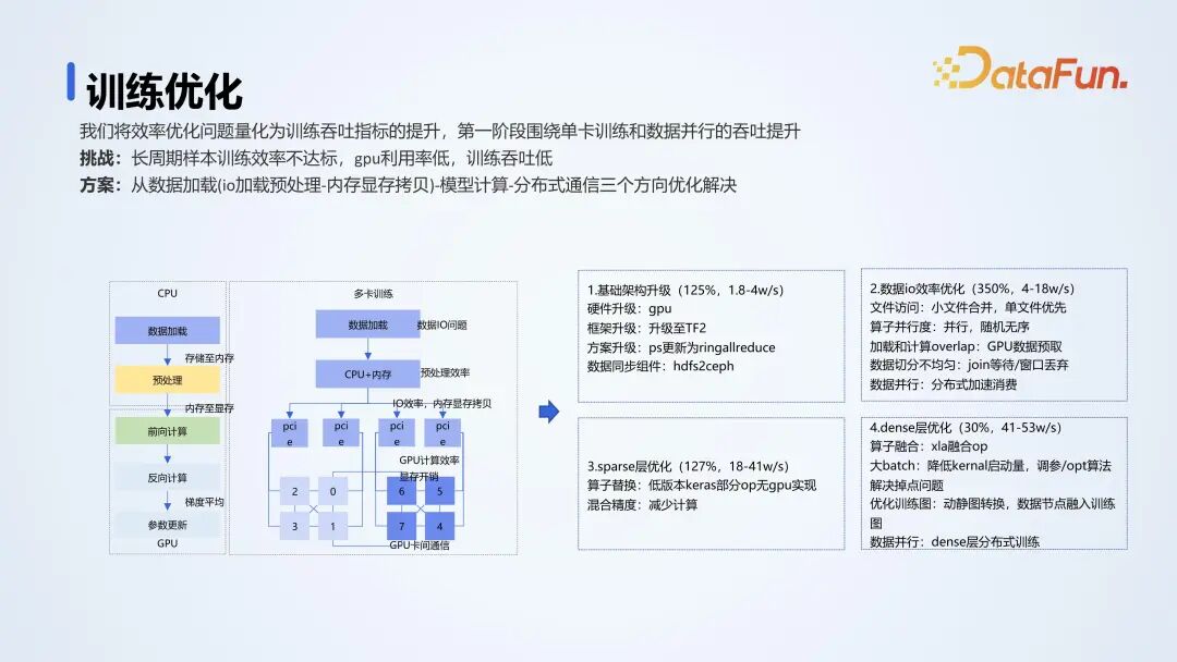 • GPU 数据加载优化:采用预加载方式,提前将接下来几个批次需要使用的数据加载到GPU,解决 GPU 数据 IO 问题。