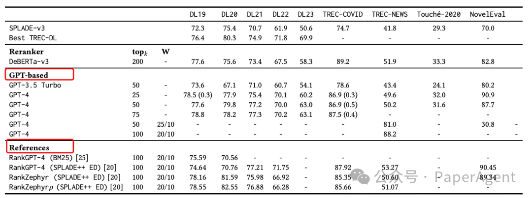 - GPT-4在某些数据集上的表现与DeBERTa-v3相当,甚至更好,尤其是在DL23和NovelEval数据集上。