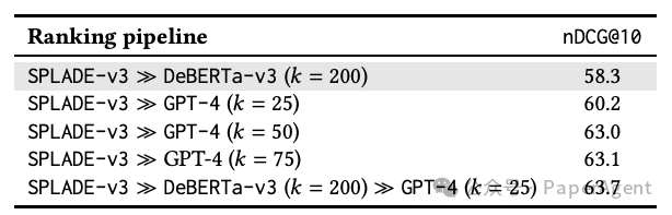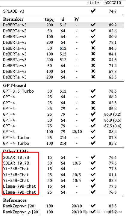 进一步比较了DeBERTa-v3重排器与OpenAI LLMs以及开放模型的性能。- 发现GPT-4在处理非常短的文档时表现非常好,即使文档被截断以适应提示长度。
