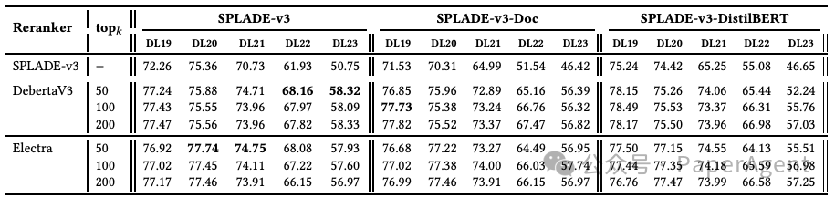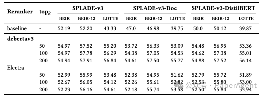 - 分析了不同重排器(基于DeBERTa-v3和ELECTRA的模型)对这些SPLADE模型结果的影响。