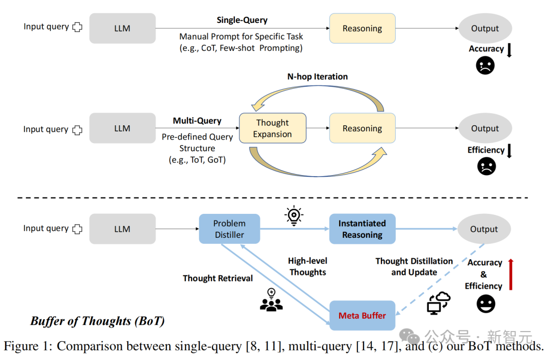 咱们都知道,GPT-4、PaLM、Llama这些大模型选手,都是完成推理任务的佼佼者了。除了扩大模型规模,还有一个办法,就是通过更有效的提示方法。这类方法主要是靠提示工程,让推理过程在单个查询中完成,比如CoT的「让我们一步一步思考」。或者Few-shot Prompting,能提供与任务相关的示例来帮助生成答案。然而,单查询推理通常需要事先假设或推理过程的相关示例,逐个任务地手动设计,显然是不切实际的。因而它缺乏普适性和泛化性。包括Least-to-Most、ToT、GoT等,它们侧重于利用多个LLM查询,来引出不同的合理推理路径,从而将复杂问题分解为一系列更简单的子问题。然而,由于推理路径的递归扩展,多查询推理在为每个特定任务找到推理过程背后唯一的内在结构时,通常是计算密集型的。另外,这两种方法都受限于设计范例和推理结构的限制,而且之前的任务做完了就做完了,它们不会从中得到高级的指导方针和思维。再遇到类似问题时,它们依然效率很低。这种新颖、多功能的思维增强框架,能够规避上述两种方法的弱点。