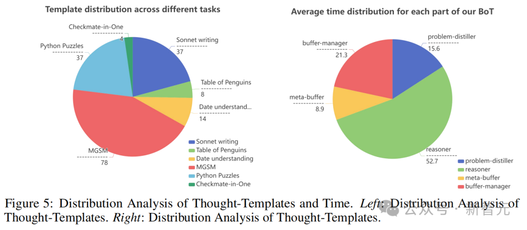 测试结果显示,在包含更多多样化场景的MGSM任务中,BoT生成了更多的思维模板。而在相对简单的任务中,则生成了更具针对性的固定思维模板。模板的分布表明,BoT可以有效地为不同的基准发现合适的思维模板。在时间成本方面,蒸馏任务信息和模板检索所需的时间相对较短,而实例化推理所需的时间较长。考虑到不同组件的复杂性,BoT整体上还是实现了相对平衡的时间成本分布,展示出了新框架的高效。