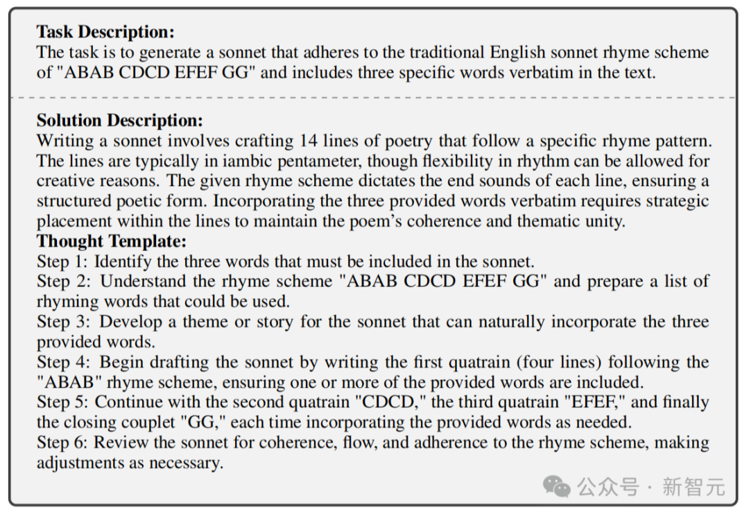 在这项任务中,LLM需要生成一首十四行诗,遵循传统的押韵模式「ABAB CDCD EFEF GG」,并在诗中逐字包含三个特定的词。