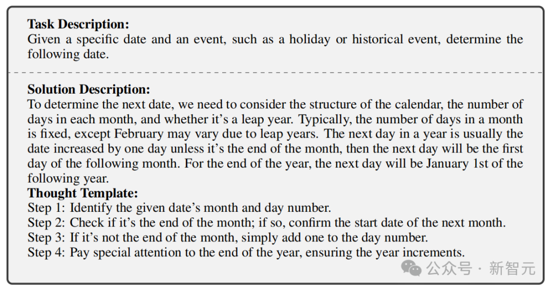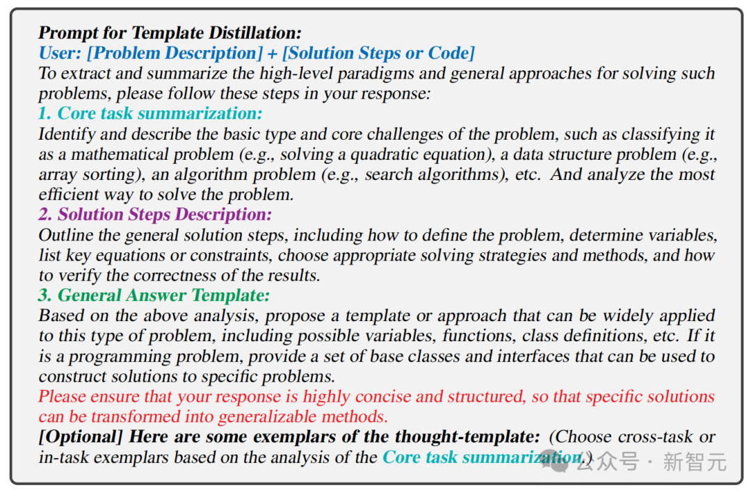 (1)核心任务总结:识别并描述问题的基本类型和核心挑战;(3)通用回答模板:基于上述分析,提出一个可以广泛应用于类似问题的解决模板或方法。此外,为了提高模板蒸馏的泛化能力和稳定性,团队精心设计了两种上下文示例来生成思维模板——任务内示例和跨任务示例。跨任务示是指,选择从某个任务中蒸馏出的模板,来解决其他任务的问题。例如,用与代码相关的思维模板来解决数学问题。在模板蒸馏之后,需要考虑是否将蒸馏的模板更新到元缓冲区中。- 如果初始化了一个空的元缓冲区或遇到没有合适思维模板的问题,蒸馏的思维模板将直接存储在元缓冲区中;- 如果是用了检索到的思维模板解决的问题,也可能会在实例化某个思维模板的过程中会产生新的见解。因此,为了在保持新生成有用思维的同时避免元缓冲区的冗余,需要计算