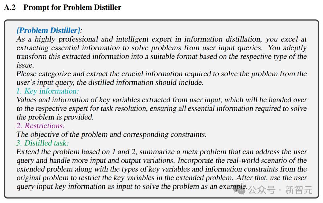 大多数复杂任务,都包含隐含的约束、复杂的对象关系以及上下文中的复杂变量和参数。因此,在推理阶段,LLM需要克服三个主要挑战:提取重要信息、识别潜在约束以及进行准确推理。因此,团队选择将任务信息的提取和理解阶段与最终的推理阶段分开,通过在推理过程中添加一个问题蒸馏器来实现。为此,他们设计了一个元提示(meta prompt)φ,用于首先蒸馏和形式化任务信息。