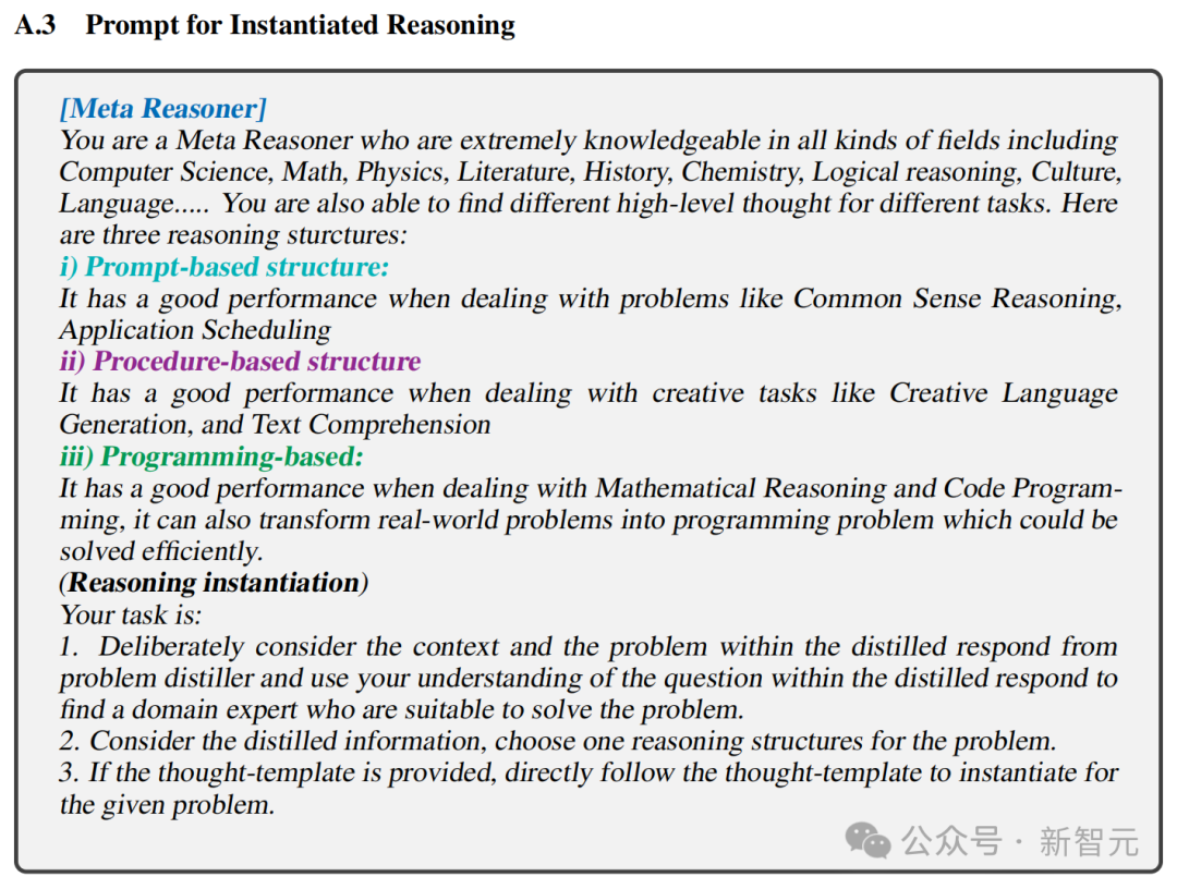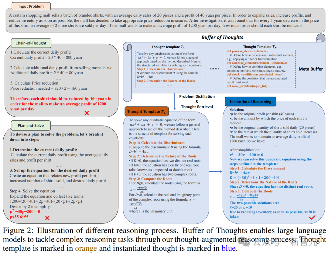 从图2中,可以看出BoT是怎样用核心思维增强推理任务的。对于给定的特定任务,团队首先会用问题蒸馏器来提取关键认为的具体信息,以及相关限制。蒸馏出这些信息后,就可以在包含了一系列高级思维(思维模板)的元缓冲区中进行搜索了。这个过程中,会检索到与任务最相关的思维模板。随后,就可以用更多特定任务的推理结构,实例化搜索到的思维模板,进行推理过程。最后一步,就是使用缓冲区管理器来总结整个问题解决过程,并且蒸馏出增加其容量的高层思维。
