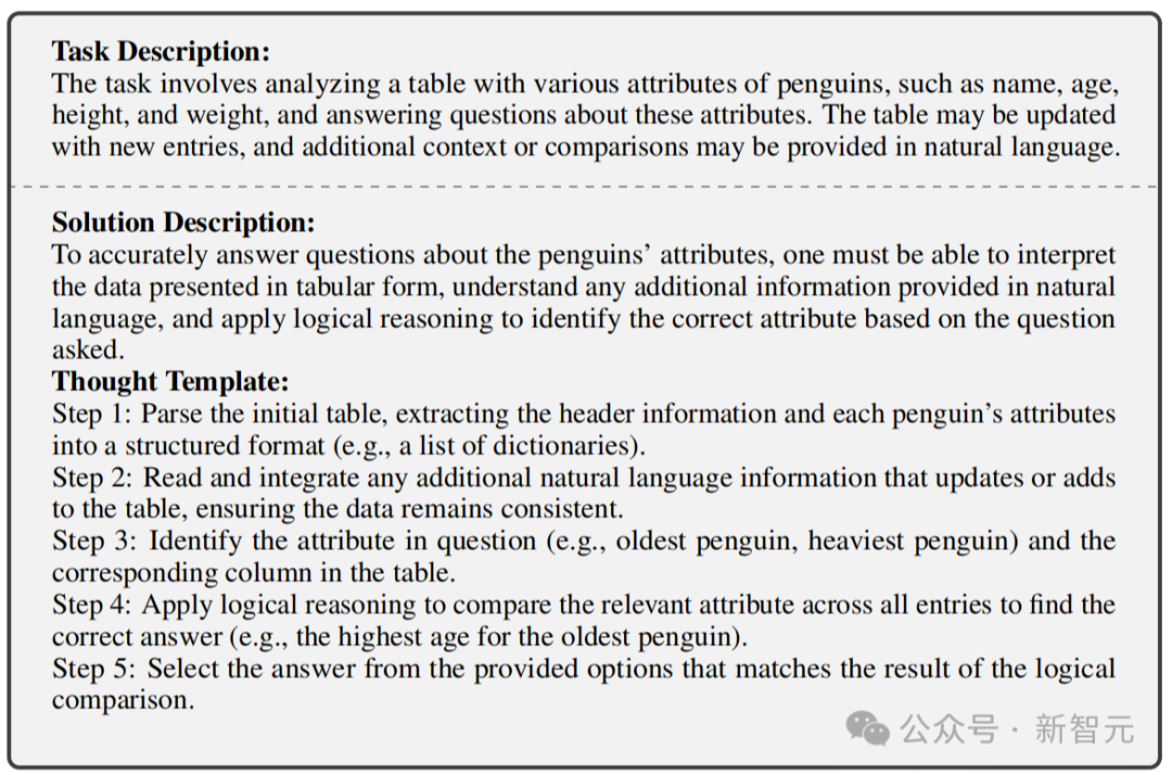 人类在解决问题时,常常总结和归纳出高层次的指导方针,然后将其应用于相关问题。正是受此启发,团队提出了元缓冲区(meta-buffer),这是一种包含一系列高层次思维(思维模板)的轻量级库,用于解决各种类型的问题。与传统方法不同,这种高层次思维模板可以在解决不同问题时自适应地实例化,从而为LLM提供更高的精度和灵活性。作为一种高层次的指导方针,思维模板存储在元缓冲区中,并由缓冲区管理器从各种问题解决过程中获取。为了让BoT能够为各种任务提供通用的推理方法,团队相应地将思维模板分类为六类:文本理解、创造性语言生成、常识推理、数学推理、代码编程和应用调度。这样的思维模板分类,可以促进模板检索,找到最适合解决不同问题的方案。其中,思维模板、模板描述及其对应的类别表示为 (Ti, D_Ti, Ck),其中i表示元模板的索引,k∈Z^+且1≤k≤6。在这个任务中,LLM需要分析一张涉及企鹅各种属性(如姓名、年龄、身高、体重)的表格,然后回答有关这些属性的问题。