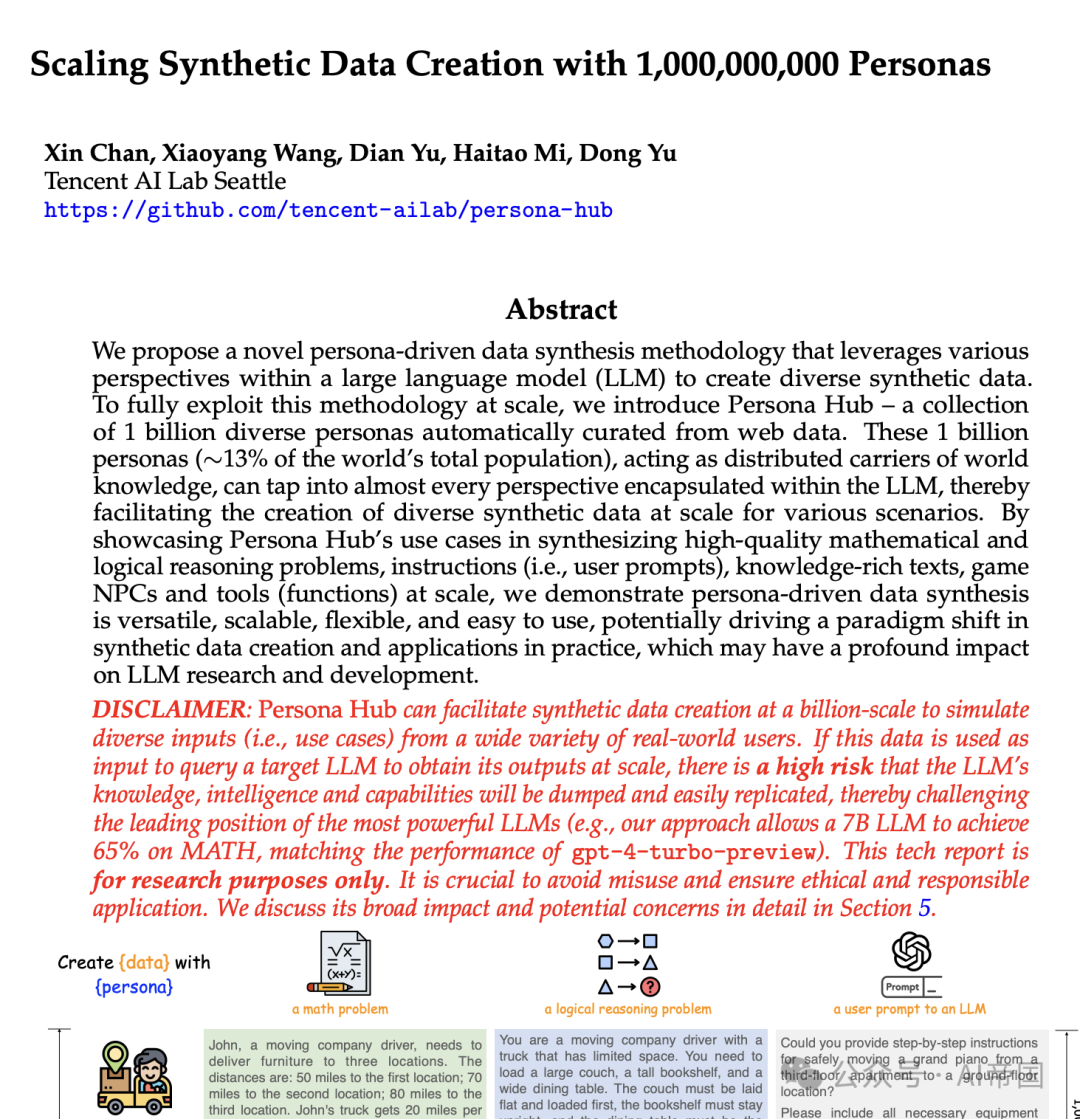 图1:角色可以与各种数据合成提示(例如,创建一个数学问题或用户提示)协同工作,引导LLM从相应视角合成数据。角色中心中的10亿角色能够以亿级规模促进各种数据合成场景的合成数据创建随着合成数据——通常指由模型或算法而非直接由人类生成的数据——在训练大型语言模型(LLMs)中日益受到重视,人们对使用LLMs进行数据合成的兴趣也在不断增长:只需指定一个数据合成提示,就期望LLM能够产生理想的合成数据。然而,在实践中,大规模创建合成数据并非易事:虽然论文可以轻松扩大合成数据的数量,但确保其多样性同步扩大却很困难。不考虑采样的情况下,给定一个数据合成提示,LLM只能产生1个实例。因此,要大规模创建多样化的合成数据(例如,10亿个不同的数学问题),就需要大量多样化的提示。先前的研究倾向于通过以下两种范式来使数据合成提示多样化,但遗憾的是,这两种方法都无法实现可扩展的合成数据创建:• 实例驱动:这种方法通过利用种子语料库(即基于种子语料库中的实例创建新实例)来使数据合成提示多样化。然而,在这种范式下,合成数据的多样性主要来自种子实例,难以真正超越种子语料库。考虑到大多数实际场景中种子语料库的有限规模,这种范式难以扩大合成数据的创建。