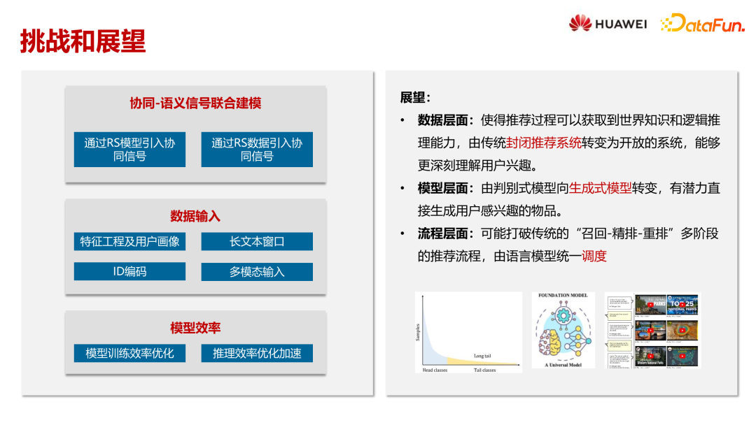 展望未来,主要从数据、模型和流程三个层面展开工作:数据层面,致力于使推荐系统具备世界知识和逻辑推理能力,从封闭走向开放;模型层面,从判别式模型向生成式模型发展,潜力在于直接生成用户感兴趣的内容;流程层面,传统多阶段推荐流程或将被统一模型取代,实现端到端的推荐结果生成。