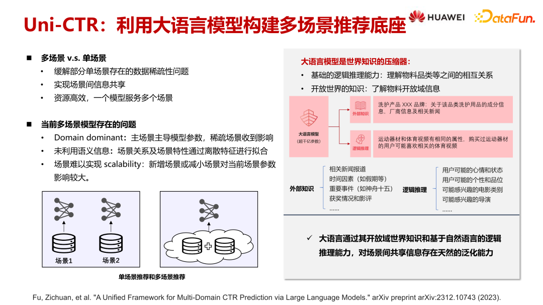大语言模型具备外部通用知识和逻辑推理能力,这在多场景建模中尤为重要。以电商和视频场景为例,大语言模型能识别洗护用品成分、市场动态及新闻等外部知识,并通过逻辑推理,如用户购买运动器材后可能偏好体育视频,实现场景间信息的自然泛化。我们将探索如何更好地利用这些能力,构建通用的多场景推荐模型。