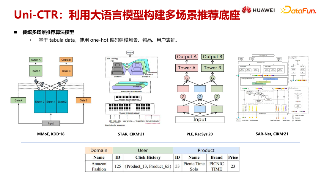 传统的推荐算法模型通常基于特定类型的数据。这些数据主要来源于表格,包含场景、用户 ID、点击历史等信息。同时,物品数据则包括名称、品牌、价格等特征。这些特征通过 One-Hot 或 Embedding 编码进行建模,并依据行为信号不断更新表征。这是传统多场景推荐算法的基本框架。