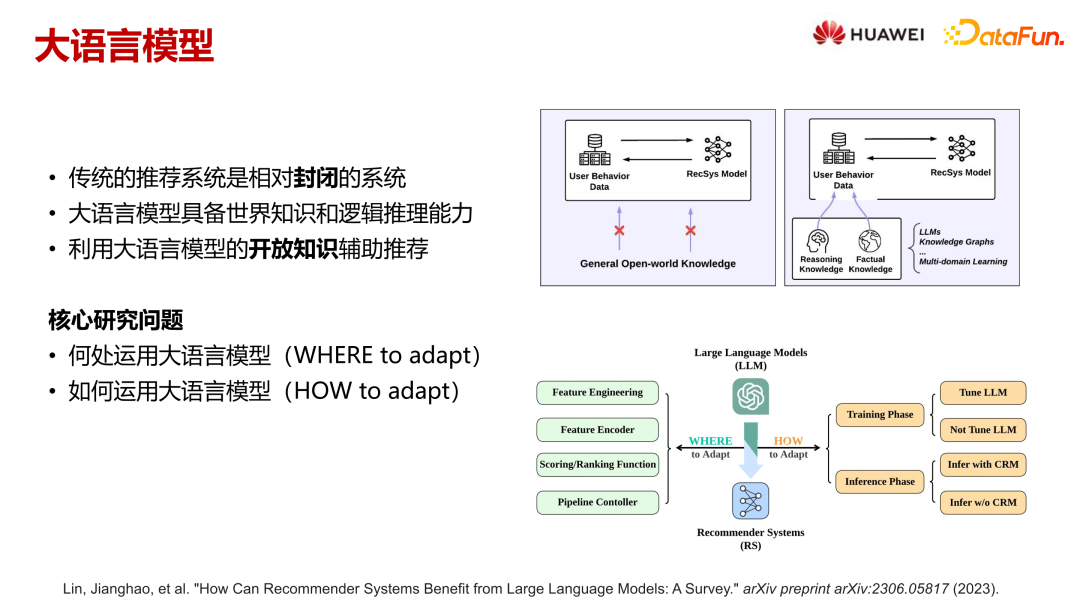 导读 来自华为诺亚方舟实验室的王奕超老师今天给我们带来了关于大语言模型在推荐系统中的探索与应用的分享,将从数据、模型和流程三个层面展开,介绍华为在推荐系统领域的两个重要项目,并回答关于用户推理知识构造、特征交叉和在线服务流程的具体问题。通过这些前瞻性的探索和应用,推荐系统的性能和用户体验有望得到显著提升。