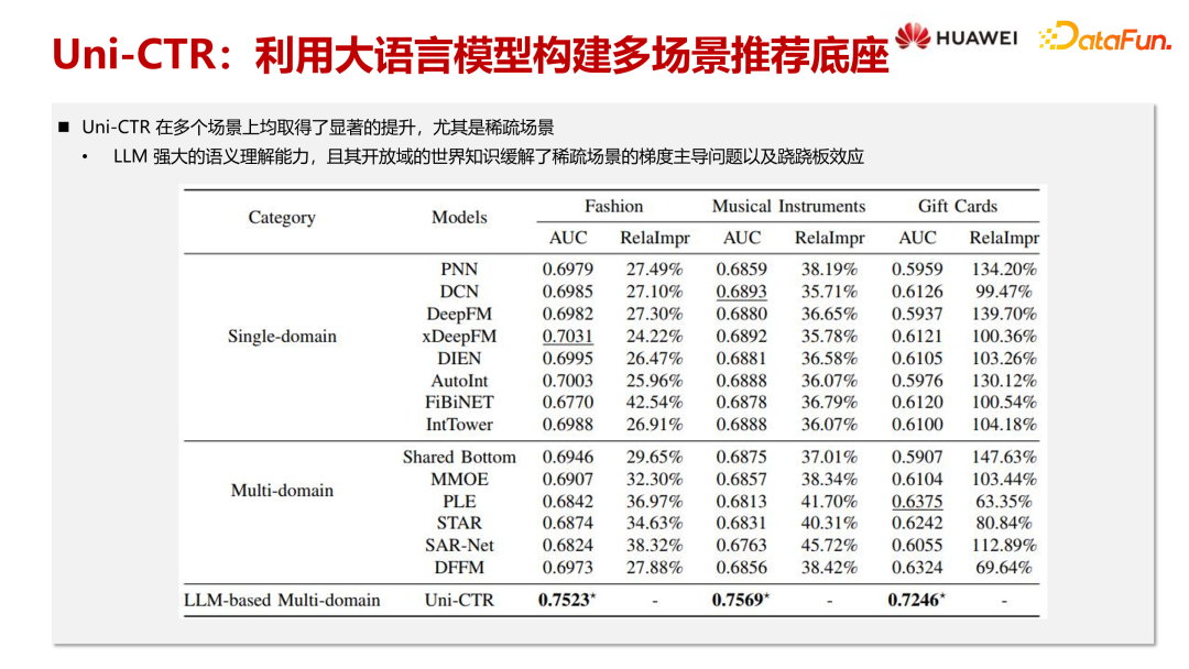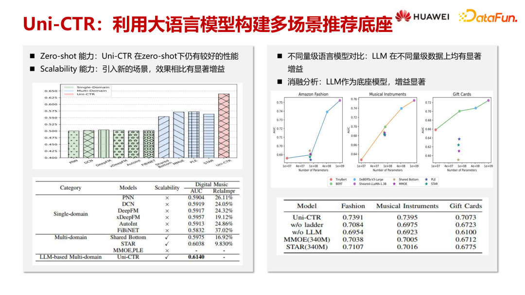 我们将 Amazon Review DataSet 中的 Fashion、Music Instruments 和 Gift Cards 三个数据集作为不同场景,来验证我们的方案。这里主要对比了三种模型:单场景独立模型、传统多场景模型,以及基于大语言模型的 Multi-domain Model。其中,Uni-CTR 是我们提出的创新方案。