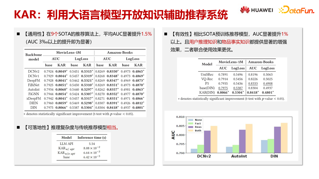 我们的实验结果显示,大语言模型在多种推荐算法上的通用性得到了验证。与未经增强的结果相比,引入大语言模型后,AUC 指标显著提升,表明开放域知识对推荐领域有显著增益。同时,我们验证了方案的可落地性,发现推理复杂度与推荐模型相当,且 KAR 方案在推理时间上与 Base 模型相近,是实际工业场景中的可行选择。