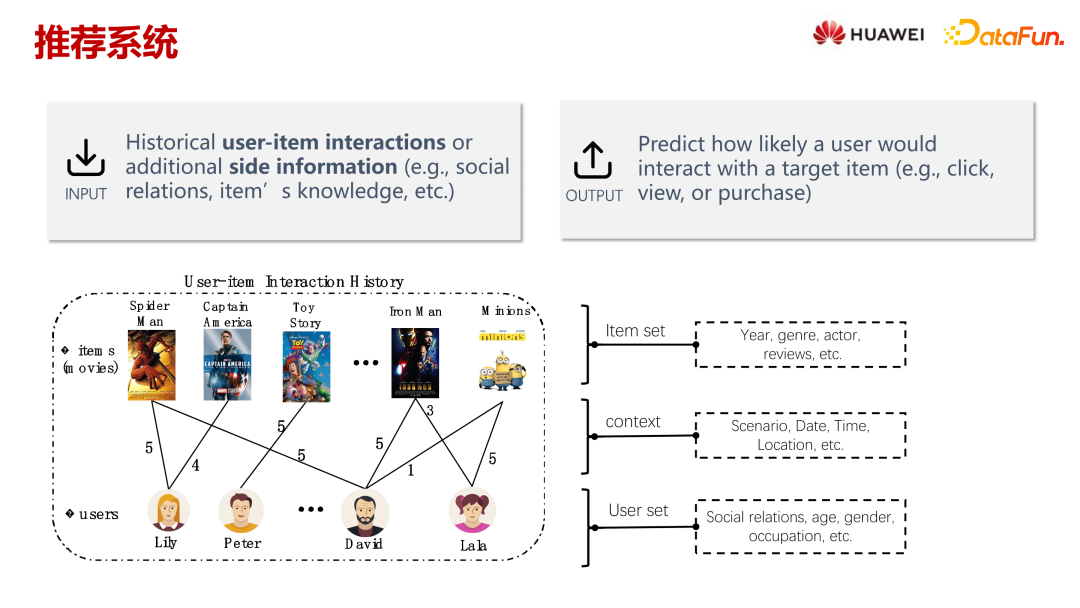 让我们从一个具体例子——电影推荐系统开始。推荐系统的输入主要是用户的交互行为,如点击或观看过的电影。这些行为反映了用户的偏好。除此之外,还有物品的特征信息,比如电影的年代、类别和演员等属性信息,以及用户的一些特征,比如年龄和性别等。推荐系统会根据这些输入信息,结合当前用户请求的一些上下文信息(如电影榜单、时间和地点等),为用户提供评分推荐。