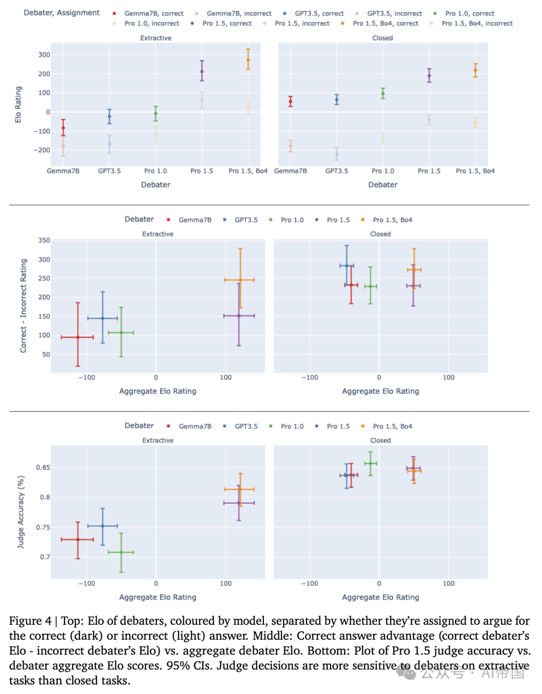 图 4 | 顶部:辩论者的Elo评分,按模型着色,区分他们是被指派为正确(深色)还是错误(浅色)答案。中部:正确答案优势(正确辩论者的Elo - 错误辩论者的Elo)与辩论者综合Elo评分的关系。底部:Pro 1.5评委准确度与辩论者综合Elo评分的关系图。95%置信区间。评委的决策在提取任务上比封闭任务更敏感 论文通过跨游戏辩论的配对(数量),并使用Pro 1.5进行评判,以计算他们的综合Elo评分。论文进一步通过将每个辩论者视为两个不同的玩家来计算正确Elo和错误Elo评分:一个被指派正确答案,另一个被指派错误答案,如附录E所述。结果 在图4(顶行)中,论文展示了每个模型的正确(深色)和错误(浅色)Elo评分,误差棒显示了来自bootstrap抽样的95%置信区间(见附录E)。论文发现,尤其是在封闭任务上,为真理辩护往往更容易,并且更强的模型往往获得更高的Elo评分。图4(中行)展示了正确和错误Elo评分之间的差异(正确辩论者的优势)与他们的综合Elo评分的关系。所有辩论者都显示出正差异,表明被指派正确答案具有优势。然而,与Khan等人(2024)相比,论文没有看到这种优势随着Elo增加而增加的明确趋势。对于提取任务,随着模型说服力的提高,诚实辩论者似乎变得稍微容易些,而在封闭任务上这种趋势不那么明显。论文随后考察了综合Elo与评判准确度(以Pro 1.5为评判者)的相关性,以观察技能更高的辩论者是否能提高评判准确度。图4(底部行)显示,在抽取式任务中,更强的模型具有更高的综合Elo,这些模型导致了更高的评判准确度。然而,在封闭任务中,辩论者之间的差异较小,无论是综合Elo还是评判准确度。这可能是因为评判者在抽取式任务中更依赖于辩论者的陈述,评判者需要依靠辩论者提供他们无法自行获取的信息。