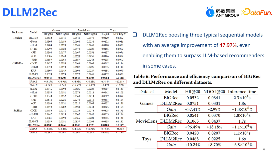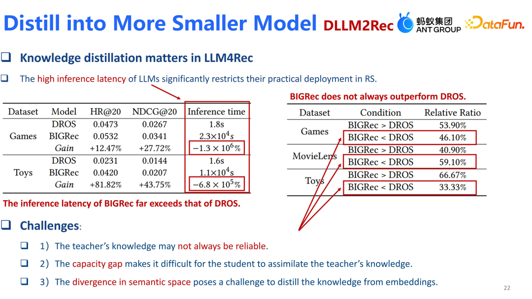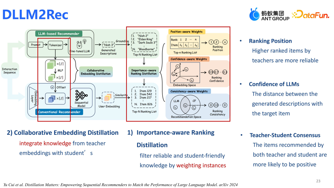 Q1:模型蒸馏到 LLAMA2 7B 还是 70B?蒸馏效果如何?A1:我们针对 LLAMA2-7B 模型进行蒸馏,效果还可以。LLAMA2 从 GPT3.5 中蒸馏出强大的推理能力,能深入理解用户行为中的内在逻辑,而不仅仅是推荐用户已知的物品。这种能力有助于消除传统推荐模型中的 bias,更准确地预测用户想要的东西。所以,我们采用 LLAMA2 来蒸馏这种能力。Q2:蒸馏后得到的小模型是用于离线推理还是在线推理?