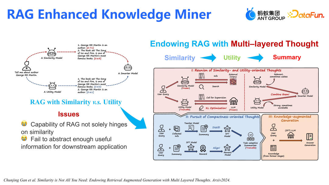 我们深知知识的重要性,但先前模型的知识处理方式过于简略。RAG 在知识挖掘中扮演着重要角色,它通过相似性模型(如 BM25)召回相关文档,再把这些文档交给 LLM,并由 LLM 生成具体的知识和关系。然而,仅依赖相似性进行检索并不能确保文档的有效性。以乔治马丁为例,我们提出一个基于实用性的模型(Utility)来优化 RAG。与仅将“乔治马丁是作者”排在首位的传统方法不同,我们的模型能更准确地识别“乔治马丁是《冰与火之歌》的作者”这一重要信息。- 生成摘要(Summary)以压缩文档长度(因为召回了成千上万的文档,可能每个文档都比较长,并不是所有的大模型都能支持长序列,所以需要一个 Summary 来压缩多文档之间的长序列,把它压缩成一个能容忍的文档长度);