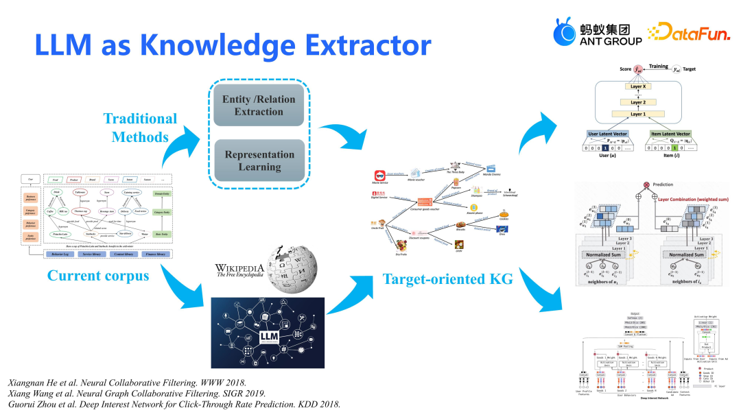 大模型作为知识提取器,核心在于从线上 corpus(包括文本和已有知识图谱)中生产适配的 KG。原先方法依赖大量标注数据进行实体和关系抽取,但只能预测现有实体对的关系,无法产生新知识。大模型的优势在于利用开放知识,生产图谱和语料中不存在的新知识,使 KG 更加丰富。我们将介绍如何通过大模型从现有语料中提取并生产适配的 KG,以便更好地应用于下游任务如协同过滤、图模型和特征交叉模型。