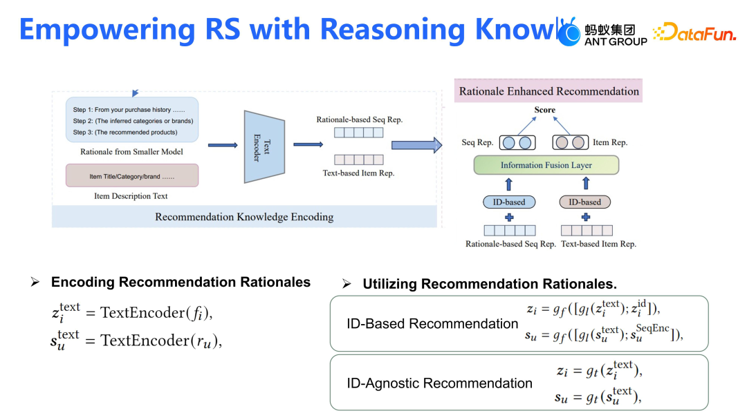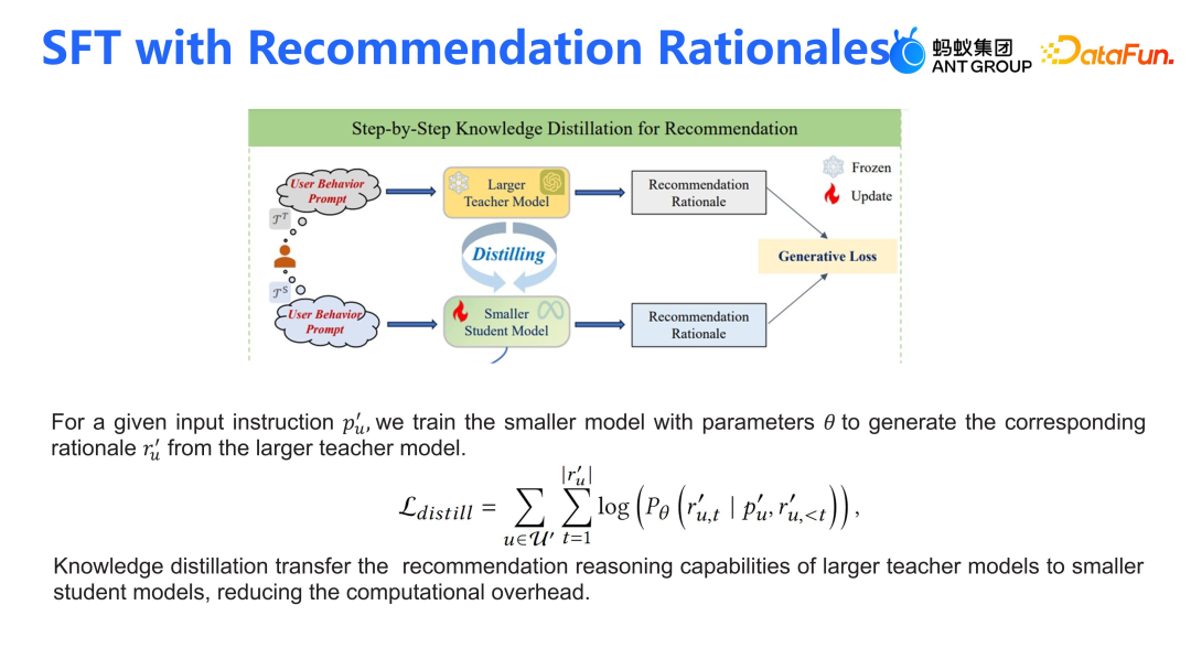 我们需训练一个小模型来生成推荐理由,这些理由基于 GPT3.5 大模型给出的预测。简单来说,这就是一个生成式 Loss(Generative Loss)的过程,其中小模型会学习如何预测并生成与大模型一致的推荐理由。
