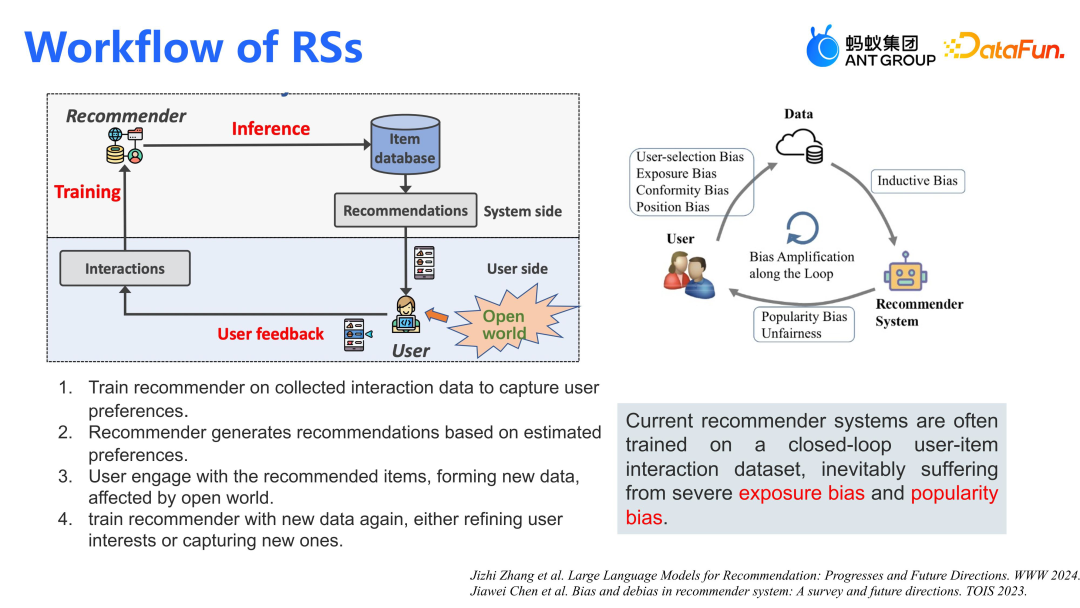 推荐系统的流程主要包括以下几个步骤:①系统基于用户反馈训练模型,以捕捉用户的偏好;②系统生成推荐结果并返回给用户;③用户与推荐商品进行交互,生成反馈;④系统收集这些反馈再去优化模型。这样形成一个完整的闭环。在这一过程中存在着一些问题,如曝光偏差(Exposure Bias)和流行度偏差(Popularity Bias),这会导致推荐结果产生偏差。为了解决这些问题,我们希望引入大模型来融合世界知识(World Knowledge),以减少偏差,使系统更加鲁棒。