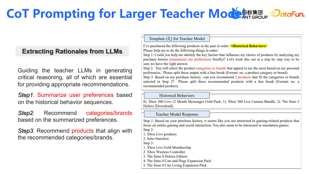 基于前述 LLAMA2 模型,能够做 T+1 推理。- 针对每个用户的行为序列,采用三步 CoT 生成推荐理由;