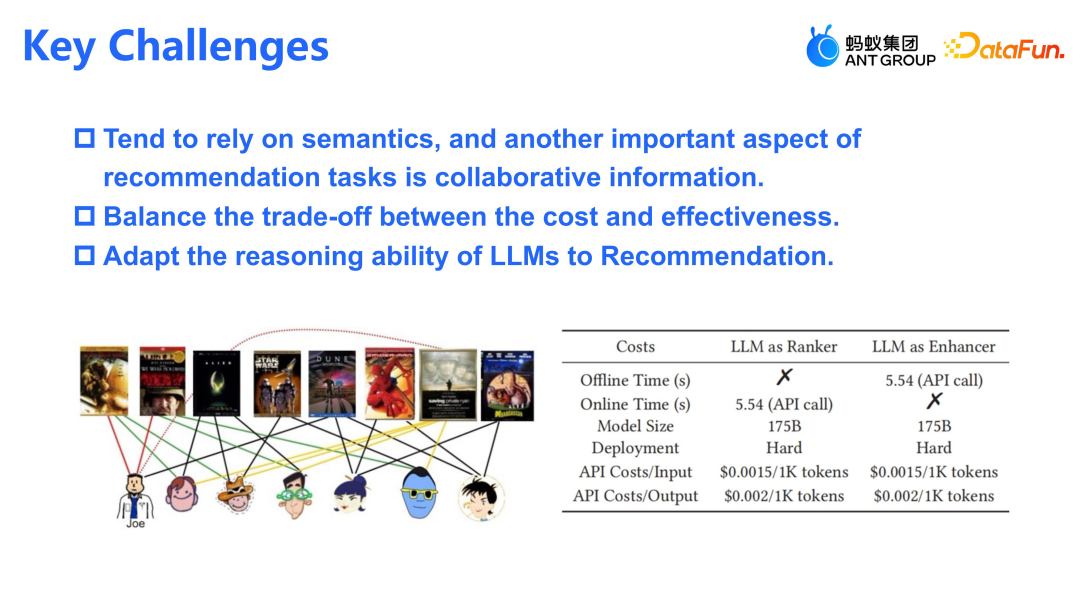 将大模型融入推荐系统面临三大挑战。第一,大模型虽依赖语义信息,但推荐系统的协同信息更为关键,单纯依赖语义模型,效果一般不及预期。第二,需平衡计算开销与推荐效果。第三,我们希望将大模型对用户行为的深度理解和推理能力蒸馏到如 LLAMA 等推荐模型中。