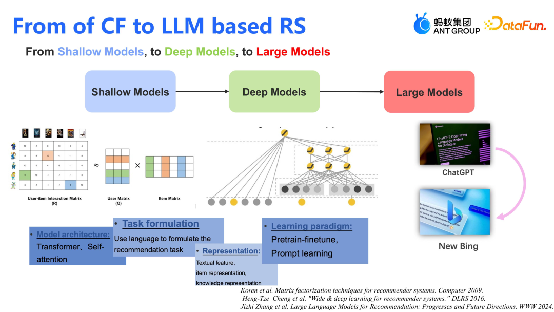 推荐模型的发展历程从传统的协同过滤到现今的大模型推荐,经历了多个阶段。最初,矩阵分解作为浅层模型(Shallow Models)被广泛应用。随后,在 2016 年左右,Wide&Deep 等深度模型(Deep Models)开始崭露头角。当前,业界主流的推荐系统大多基于 DNN(深度神经网络),如 Wide&Deep 或 MOP(多目标优化)及其变种,用于线上服务。而随着大型模型(Large Model)的兴起,推荐系统正在朝着融合大模型能力的方向发展。这不仅仅是纯生成式的推荐,更多的是将大模型(如 ChatGPT)的技术能力融入到推荐模型中。