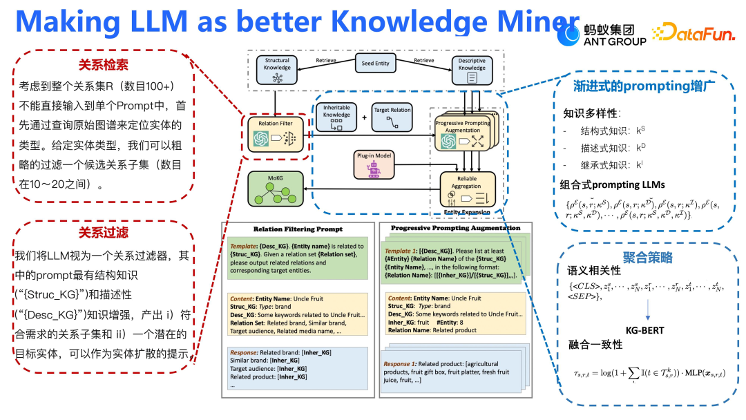 大模型生产知识的核心流程包括两步:第一步确定所需生产的关系类型,第二步基于这些关系生成实体。例如,要生成与阿里巴巴相关的品牌和企业关系,大模型会先识别出这些关系,然后生成对应的实体,如腾讯、字节等,形成三元组关系。整个流程基于条件概率,给定源节点 S,大模型会推理出关系 R 和目标实体 T。整个框架包含三个关键步骤:知识获取、关系过滤和目标实体生成。①大模型从 S 中提取相关知识;②基于这些知识和 S 生成关系 R;③结合 S 的知识和 R 生成目标实体 T。难点在于确保大模型真正理解所需知识,并避免生成不相关或无关系的信息。例如,对于“Air”这个实体,我们可能需要大模型生成与球类品牌相关的知识,而非偏向空调。此外,由于一个实体可能涉及众多关系,关系过滤成为一大挑战,需要设计合理的 prompt 来指导大模型在关系池中选取正确的关系。大模型对 prompt 非常敏感,因此设计高质量的 prompt 对于生成目标实体至关重要。