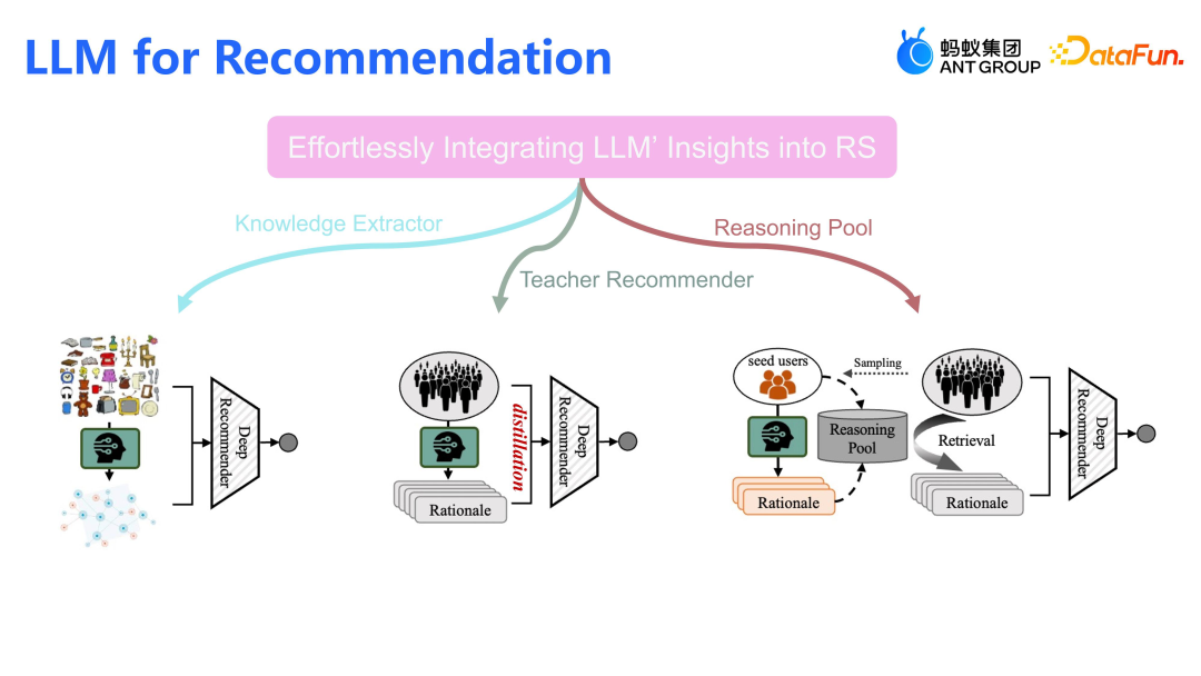 A2:LLAMA2 是用于离线推理,在线推理还是筛选不了;而后续的序列模型可以用于在线推理,LLAMA2 继续蒸馏后的小模型,其实是非常小的模型,它就是一个传统的推荐模型,可以部署到线上。Q3:对数据稀疏的低频场景来说,大模型结合推荐系统一般怎么设计?A3:蚂蚁/支付宝的数据天然稀疏,我们通过大量工作进行知识抽取,就是让稀疏场景能泛化出一些更加高活的场景,通过一些知识连通起来。基于这些知识,我们使大模型在推荐系统中运用 RAG 等策略,通过检索抽取的知识,或直接将图谱特征应用于稀疏场景,来强化特征表示。去年,我们做了大量的工作,致力于通过知识来挖掘知识,打通数据稀疏场景与数据丰富场景的一些链路。