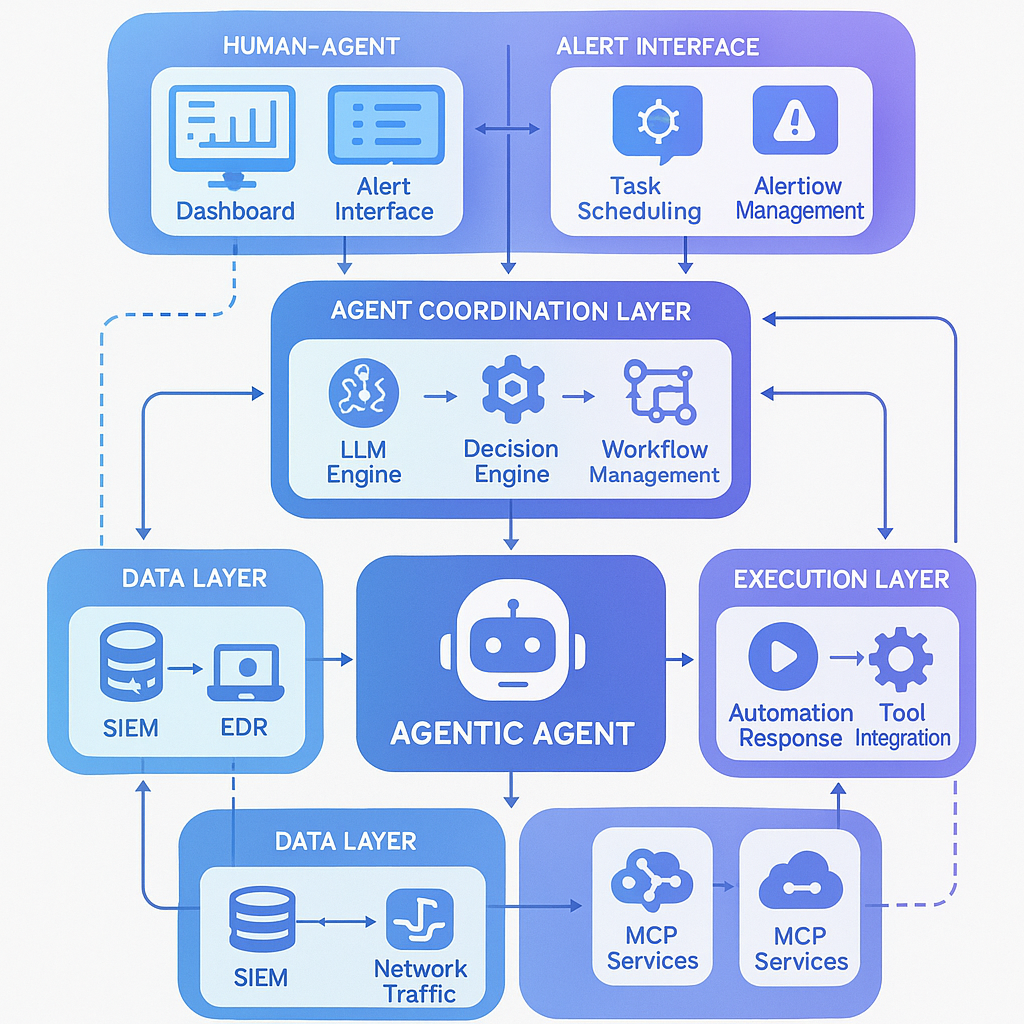 为使自主智能体能够与现实世界的安全工具进行交互,需要一个标准化的“连接层”。MCP(Model-Controller-Proxy或称模型-控制器-代理)服务应运而生,它充当了智能体与各类安全工具(SIEM, SOAR, EDR等)之间的桥梁和代理[6]。