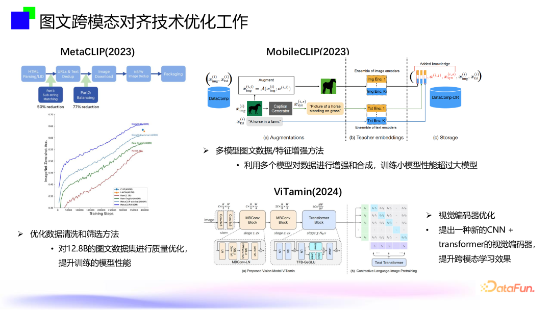 MobileCLIP(2023)小模型优化:Apple 提出了 Mobile Clip 方案,结合多模态强化训练的方法,利用多个模型进行数据增强,最终提升了移动端模型的性能。