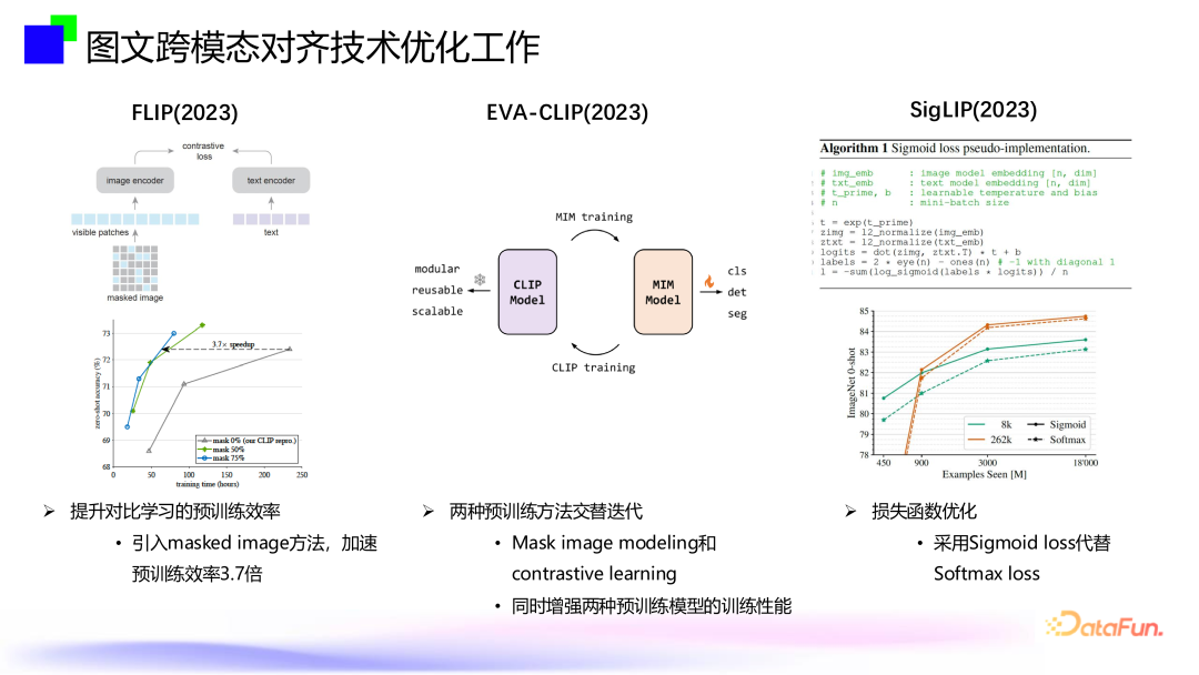 EVA-CLIP(2023)高效训练技术:为了提高训练效率和模型性能,多家研究机构提出了包括 Mask image Modeling、数据预训练方法、以及移动端优化等技术。例如,Meta 提出的 Eva 模型通过增加训练数据质量,提高了 Clip 模型的训练效率,同时减少了计算资源的需求。